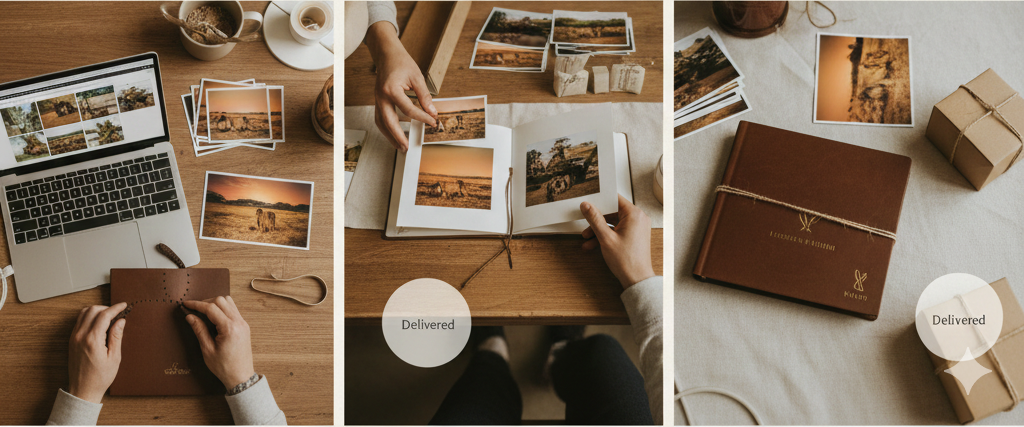 Each album is made using luxury materials — genuine leather, eco-leather, lay-flat pages, and archival inks — ensuring your safari memories can be passed down for generations.