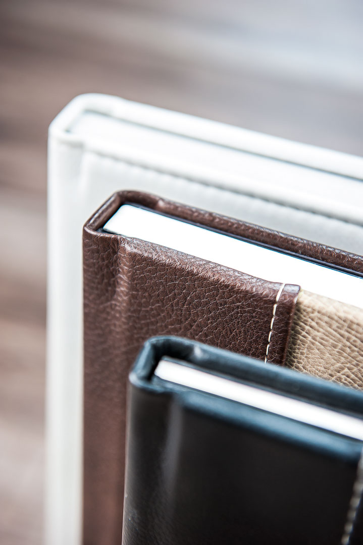 Luxury photo albums available in genuine leather or eco-leather, with elegant embossing and premium lay-flat pages.